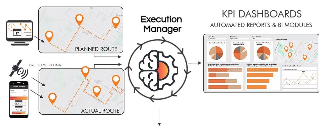 Execution Manager: A real-time control tower that merges planned routes with live telemetry data. Provides ultimate visibility, offering meaningful metrics and actionable intelligence that empowers your fleet to operate at peak efficiency.